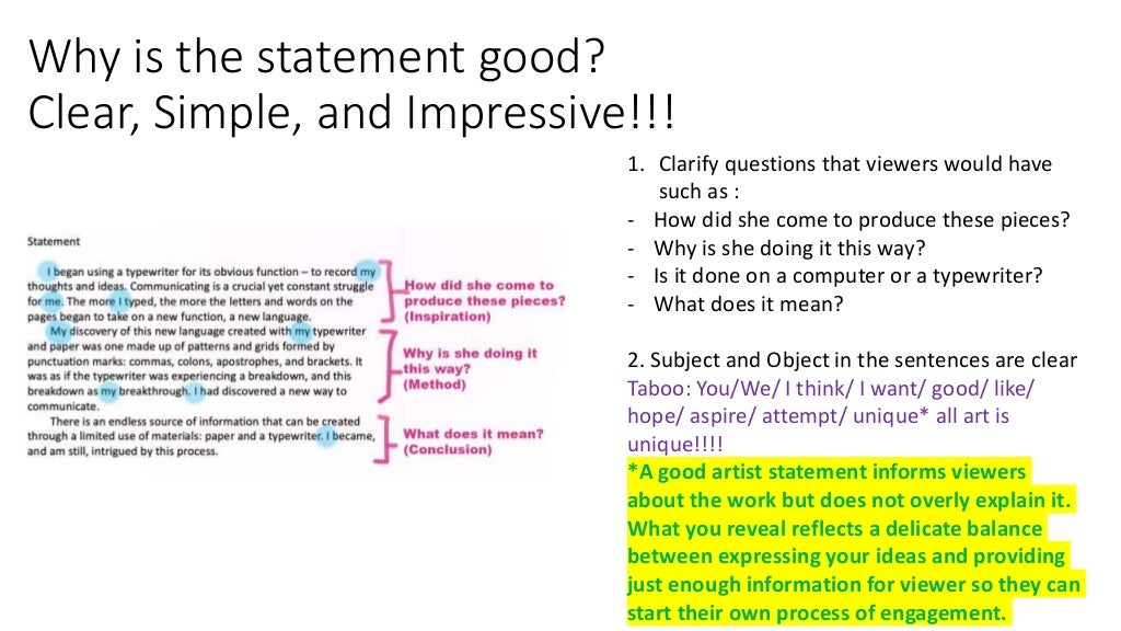 Often artists are instructed to write a three-paragraph. Use I and me. This article discusses what should be included in an artistic statement and how to compose one while also providing good examples of artist statements.